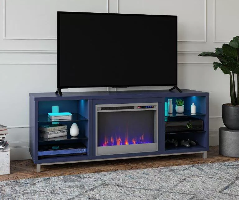 - Combines sturdy metal parts with beautiful navy laminated particleboard, hollow core and MDF with tempered glass to make a sleek and modern fireplace stand