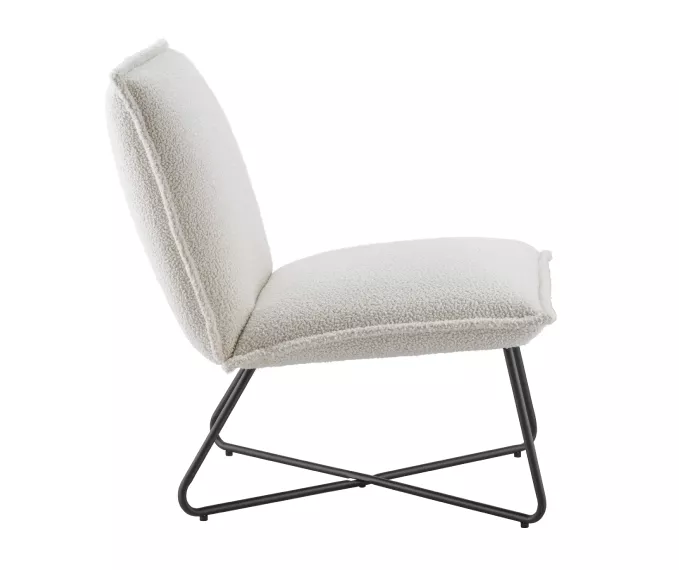 Casual comfort with sophisticated styling. Just the right amount of pillow softness floating on a sturdy metal wire base. Upholstered in a naturally comfy faux Sherpa fabric. Legs are in powder coated in black with floor protecting pads. Great in any youth or adult bedroom, in a family room or wherever. Destined to become your favorite chair to curl up with a good book.