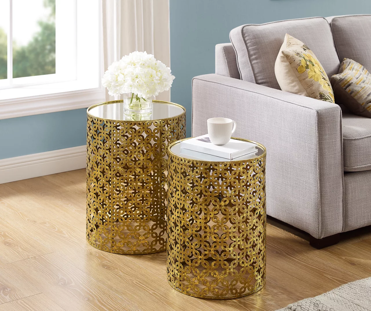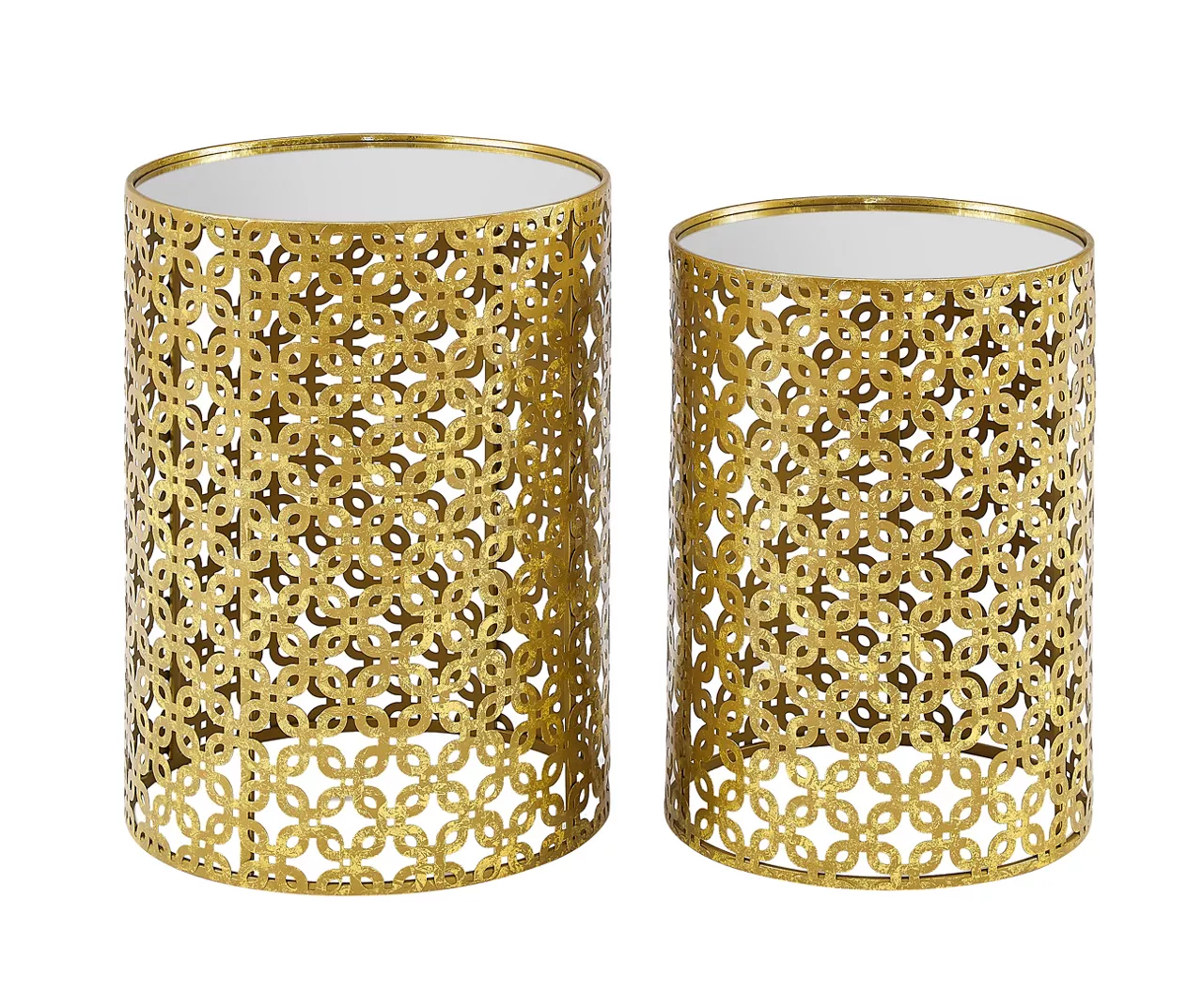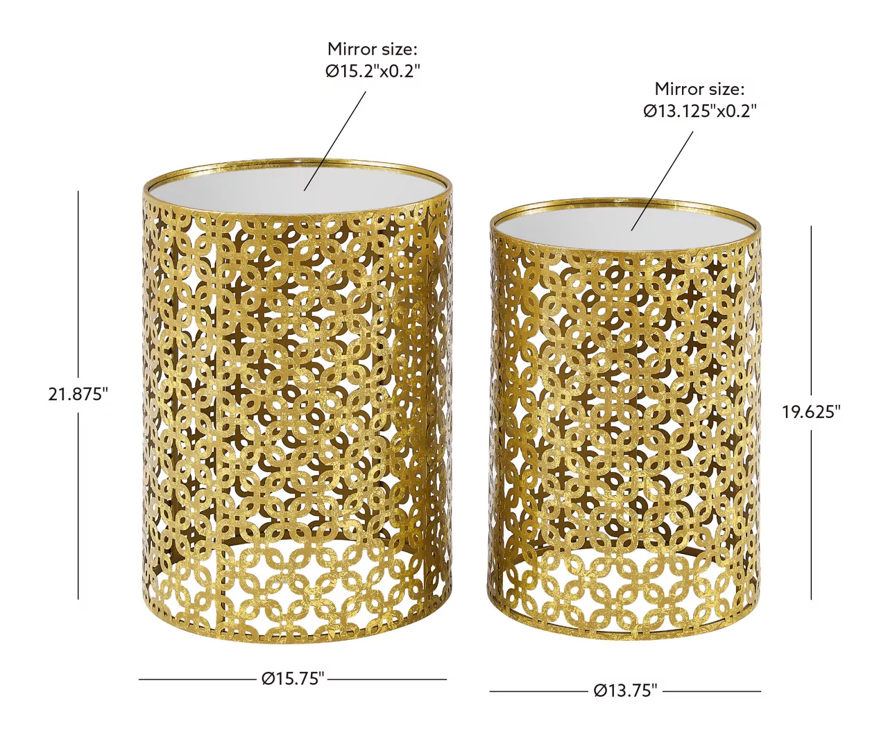 Dazzling and chic, this set of two nesting tables injects a glamorous style and shine into any room. A gleaming gold leaf finish and mirrored top give this set an opulent look while the delicate, round design offers incredible versatility. Feature these tables together for a bold, cohesive look or add them to separate room to inject glitz and style throughout your home.
