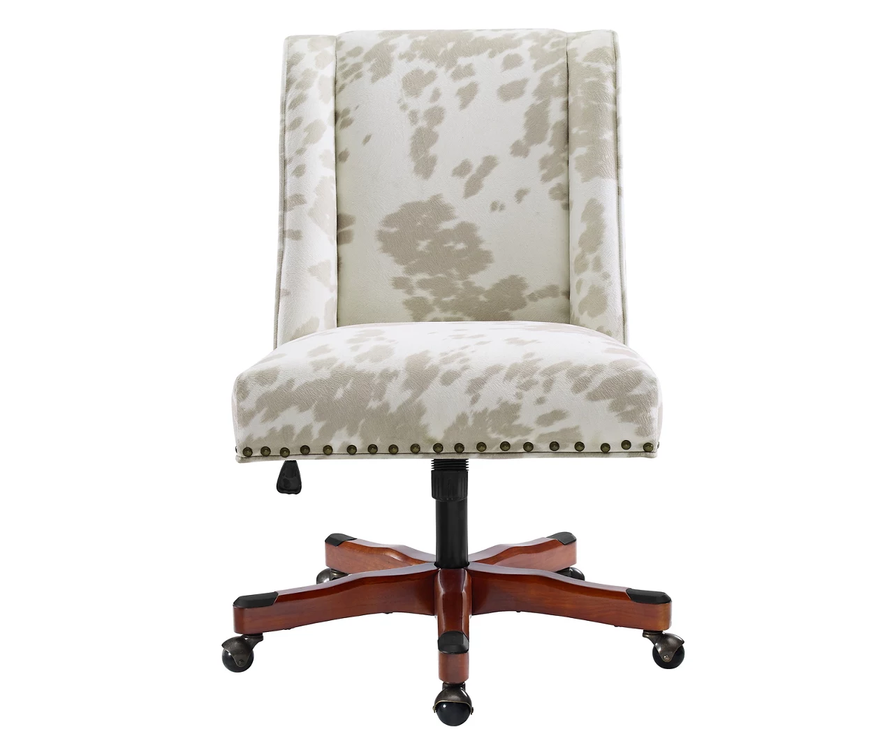 Add style and comfort to your office with this Austin office chair. The soft, plush frame is upholstered in a neutral cow print fabric and accented with antique brass nailheads. A walnut wood base has metal casters that provide for easy mobility around your office space. The adjustable seat height ensures this chair works for a variety of table heights.