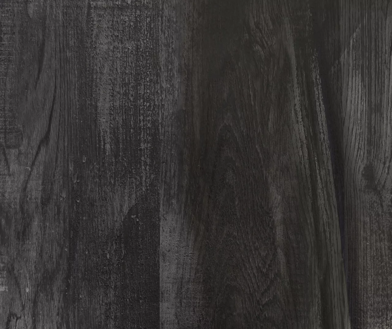 - Thick table top with a black reclaimed wood-look finish