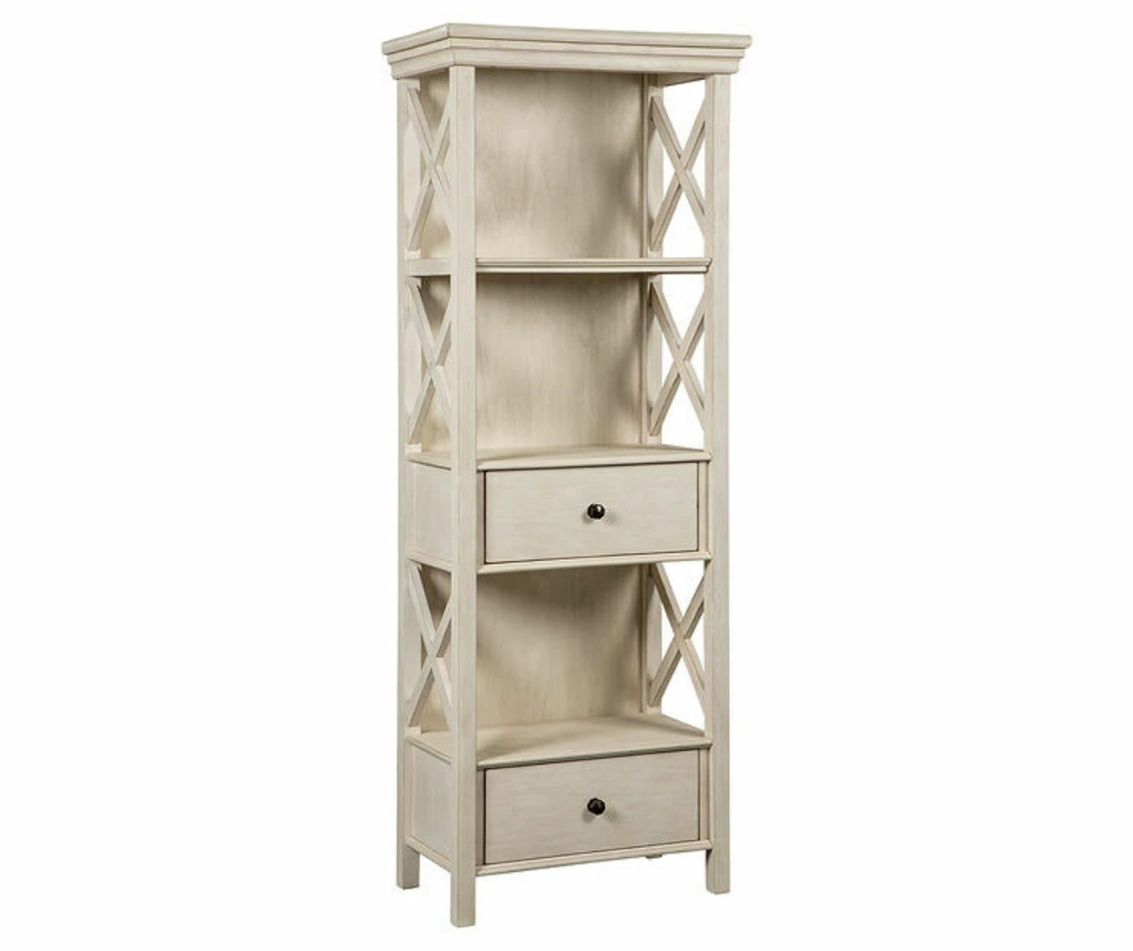 Need a stylish space to showcase dinnerware, pictures, decorations and more? This tall three-shelf display cabinet is a dream come true. The textured antiqued white finish provides a perfect backdrop for presentation. For the items you want to hide, there are two deep drawers. Embellished with the casual appeal of lattice sides, attractive crown molding, clean lines and lightly distressed finish, this cottage-style shelf provides ample storage in such an artful way.