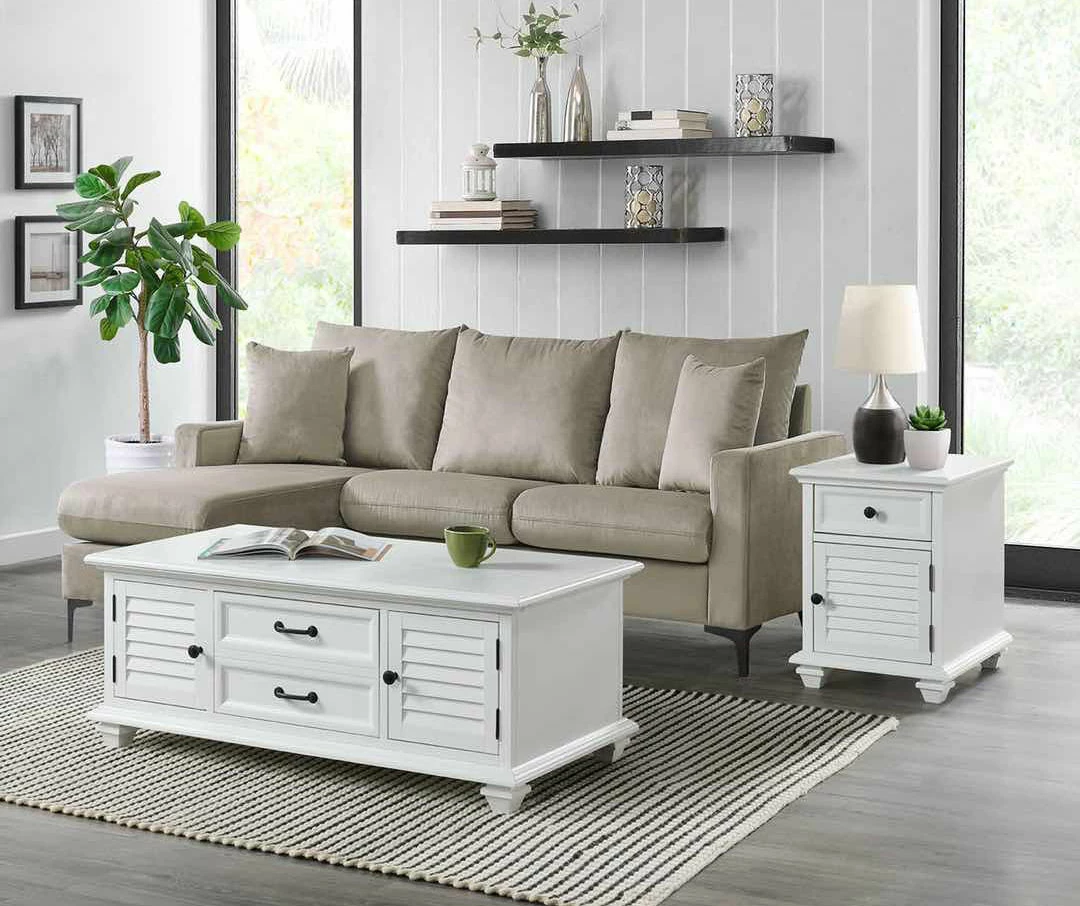 Introduce a coastal Southern look to your home with the Broyhill Charleston end table. Offering convenient and thoughtful storage solutions, this side table features a casual, yet genteel appearance with a classic shuttered door and white sapele veneer. Use it at the side of your furniture to elegantly store and stylishly display your items.