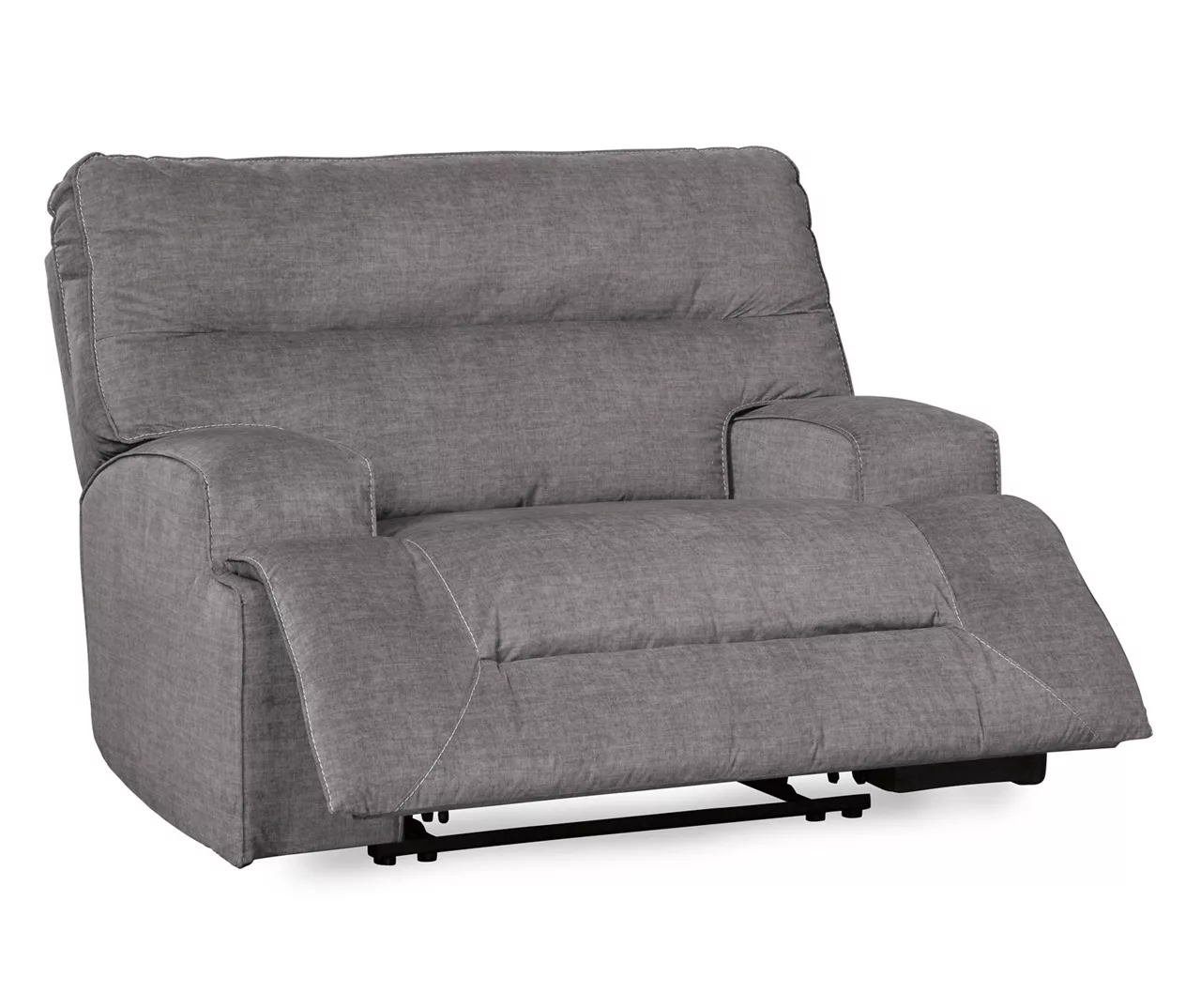 This wide seat recliner from Ashley makes it hip to be square. Brilliantly boxy profile and wide track arms infuse a highly contemporary look you don’t often find in reclining furniture. Rest assured, the trendy charcoal-tone upholstery is sumptuously soft and made all the more enticing with deep channel tufting for clean-lined flair, making this a neat addition to a living or family room.