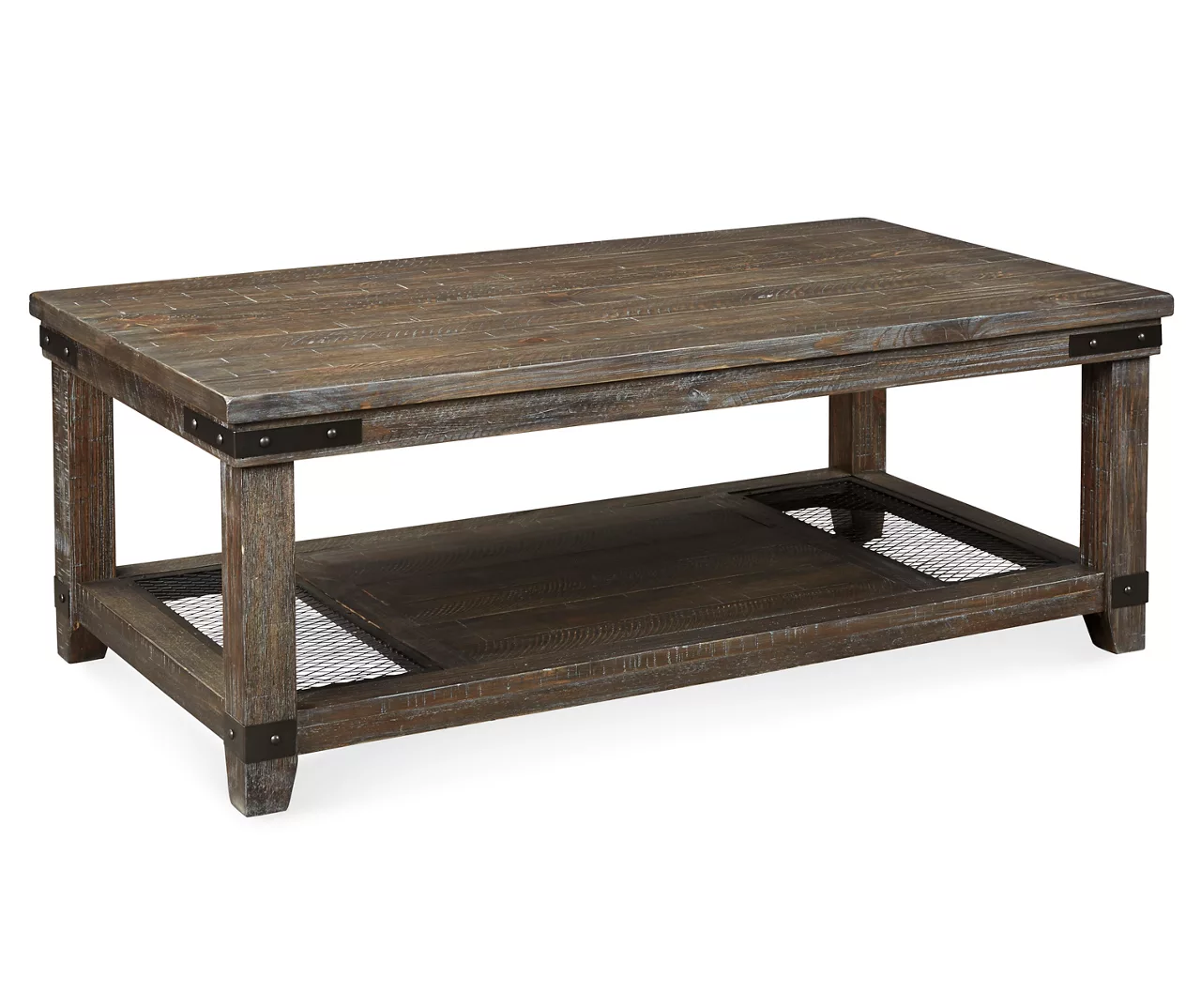 - Industrial inspired coffee table with distressed gray and brown finish featuring light wire-brushed texture