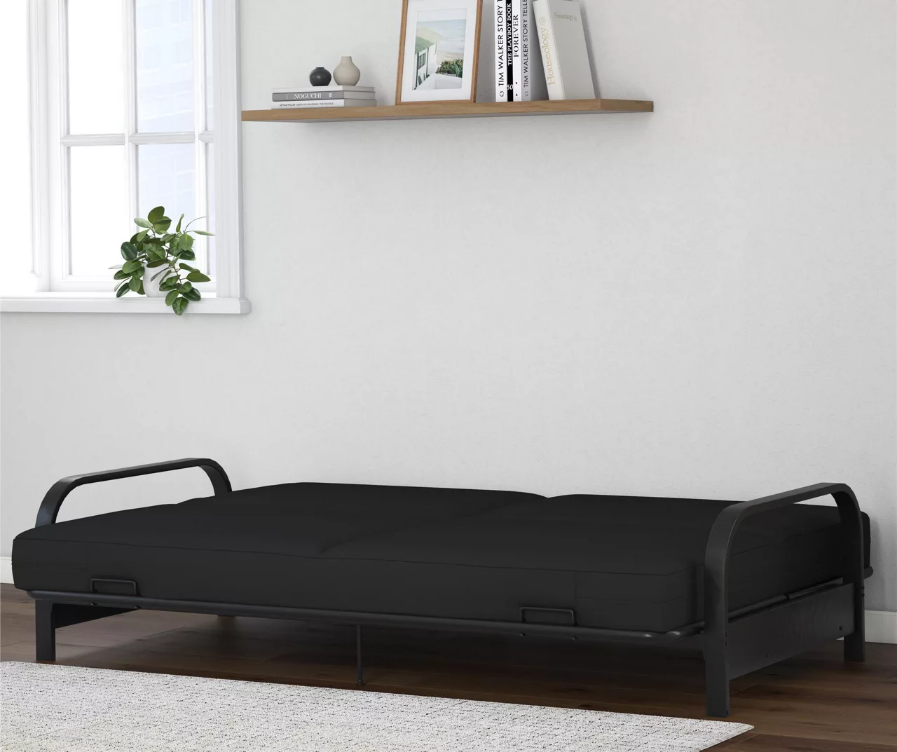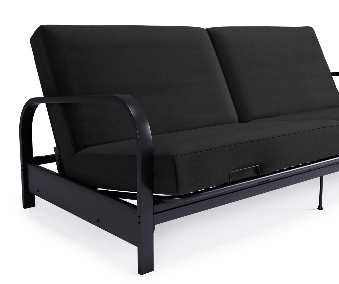Contemporary and clean, you can never go wrong with the DHP Elbern futon. Whether you’re looking for the perfect furniture piece to decorate your small space living room, guestroom, den or home office area, the Elbern takes space saving style to the max by letting you simply lower the backrest to turn it into a practical guest bed. Displaying a stylish curved slope on the arms of the sturdily built metal frame, its strong construction includes two front retainer clips that prevent the futon mattress from sliding off and center legs for added sitting, lounging and sleeping stability. The included pocketed microfiber fabric slipcover fits the provided futon mattress pads to a tee and feels soft to the touch.