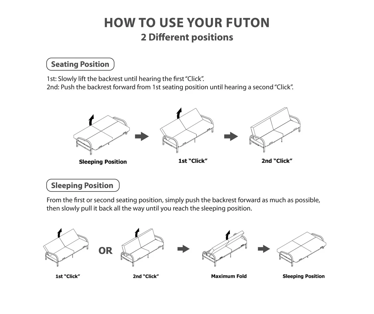 - Sturdy metal frame features 2 extra legs at the back of the seat for additional support and 2 retainer clips that prevent the futon mattress from sliding off