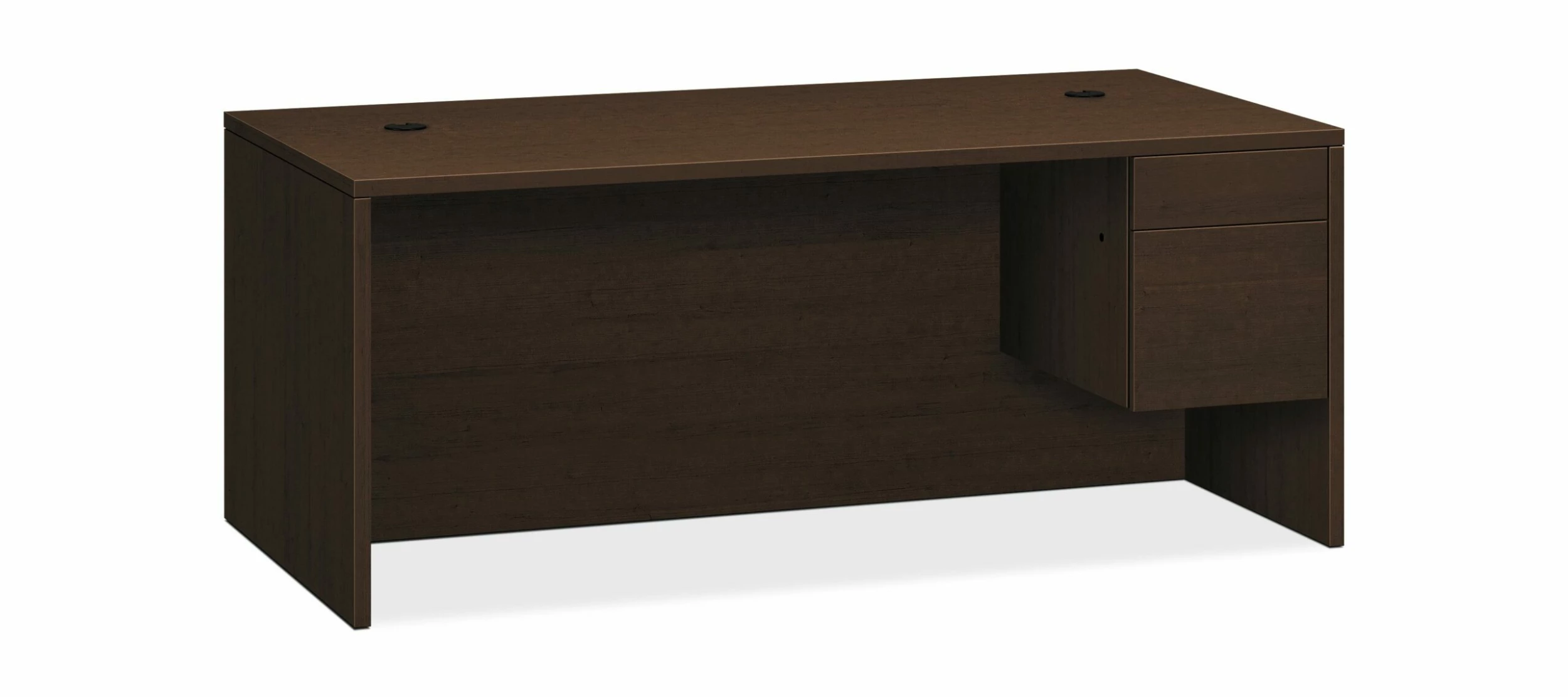Build a hard-working workstation with 10500 Series laminate from HON, our bestselling desk collection. This right desk can be combined with a left return to create an L-workstation. To create a U-workstation, combine with a bridge and left credenza. Laminate color is Mocha.