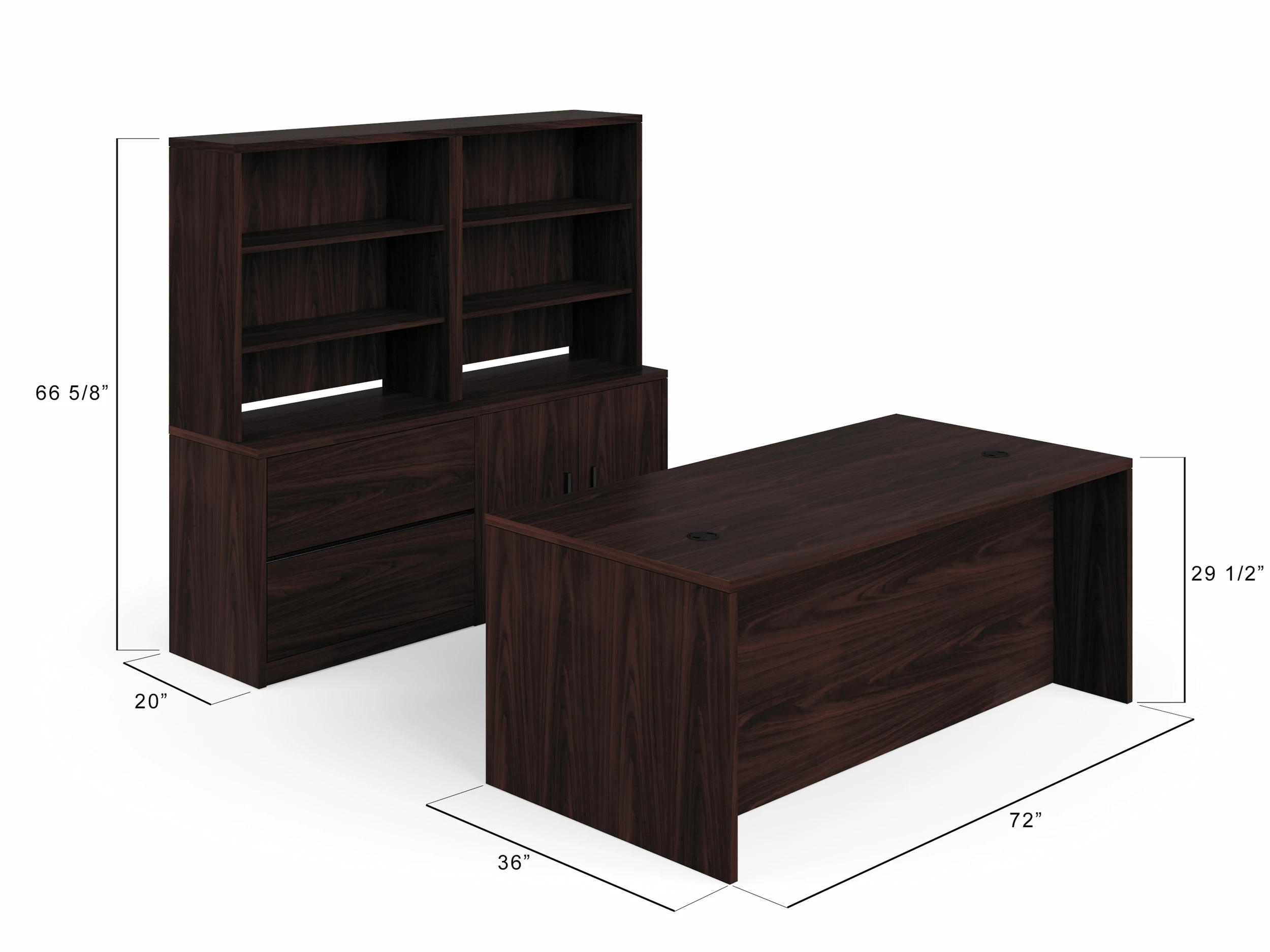 Build a hard-working workstation with 10500 Series laminate from HON, our bestselling desk collection. In this executive workstation with storage, the desk supports both meeting and computing activities. Across the back are a two-drawer lateral file and locking two-door cabinet for maximum secure storage. The two bookcase hutches provide convenient additional storage. Laminate color is Mahogany.