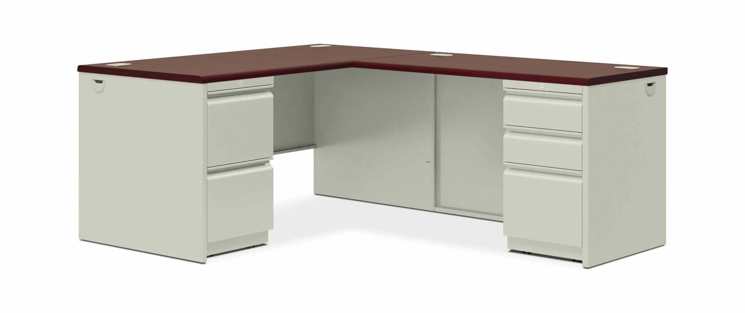 The popular 38000 Series from HON features a high-pressure laminate top with waterfall-shaped edges. This 60″W shell accepts Brigade or Flagship pedestals. It can be combined with a return, return shell or peninsula to create an L-workstation. To create a U-workstation, it can be combined with a bridge and a desk shell or single pedestal desk. Laminate color is Mahogany, paint color is Light Gray.