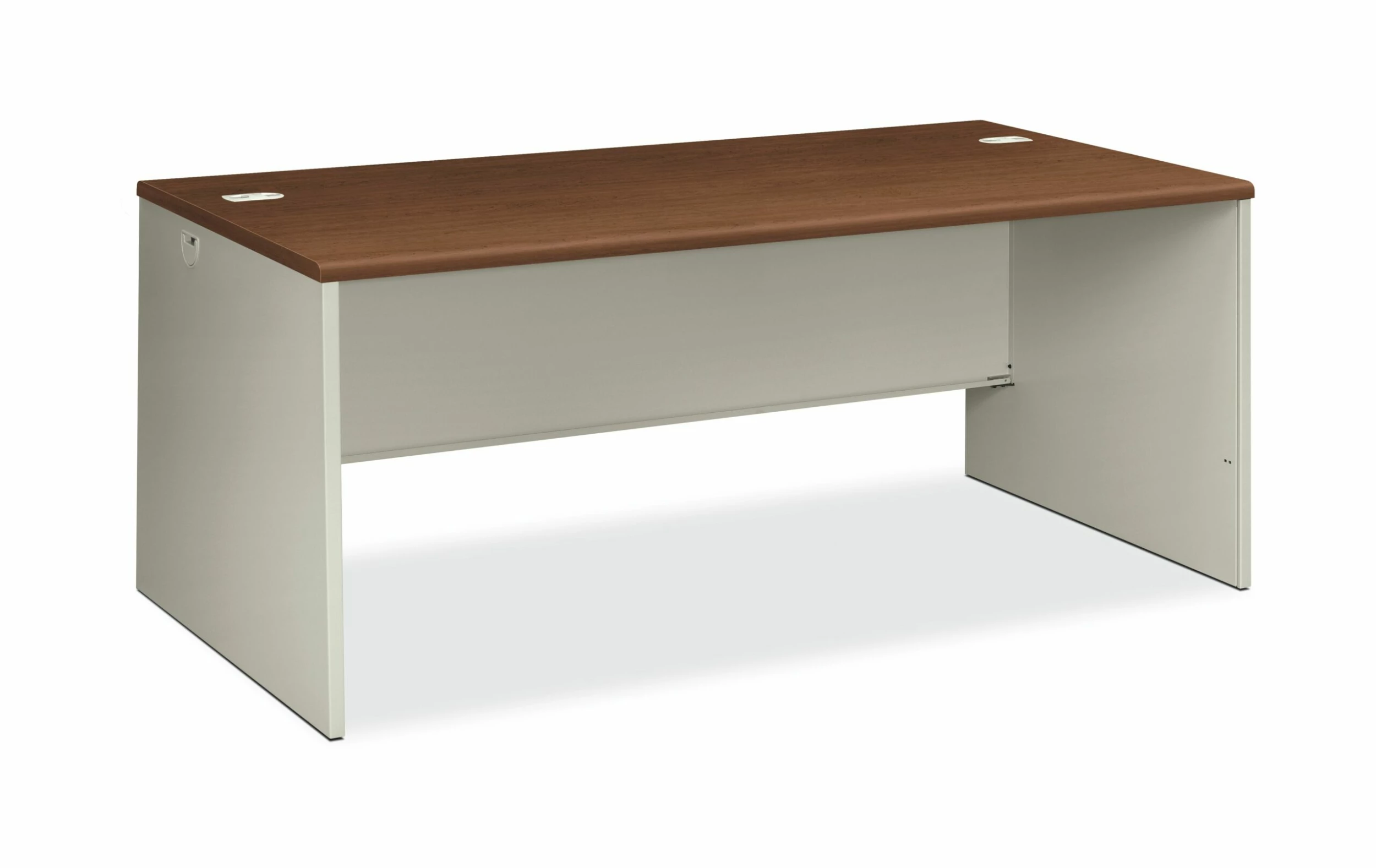 The popular 38000 Series from HON features a high-pressure laminate top with waterfall-shaped edges. This 72″W shell accepts Brigade or Flagship pedestals. It can be combined with a return, return shell or peninsula to create an L-workstation. To create a U-workstation, it can be combined with a bridge and desk shell or a single pedestal desk. Laminate color is Shaker Cherry, paint color is Light Gray.