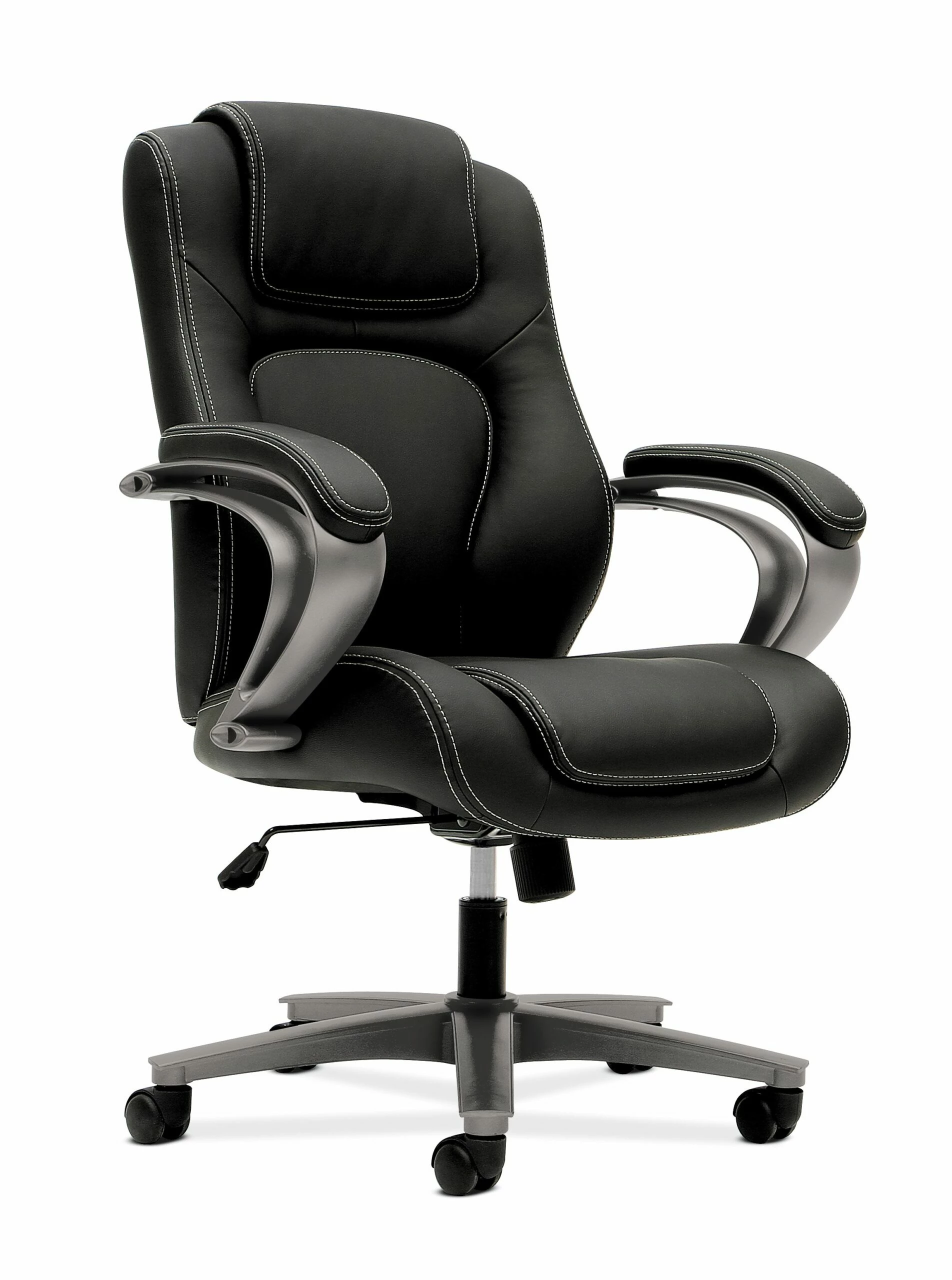 This HON executive mid-back chair has center-tilt with lock and tension control. Durable vinyl upholstery, a waterfall seat edge and dramatic arms and base give this chair an upscale feel at a compelling price. Vinyl upholstery color is Black and base and frame are Silver.