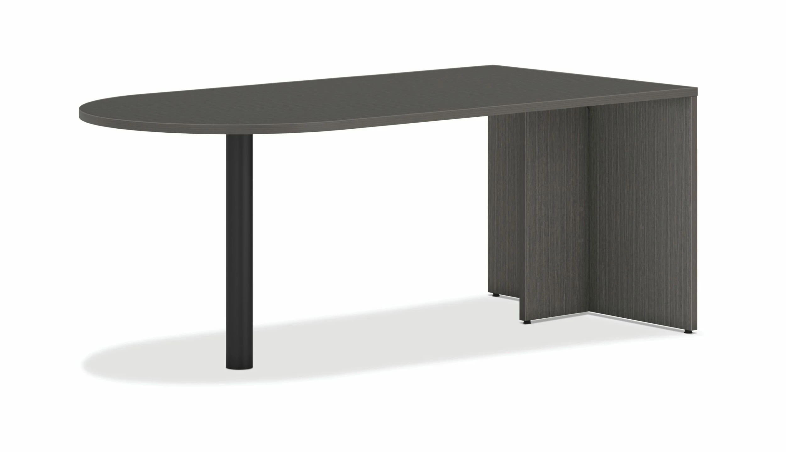 There is always beauty in simplicity, but with the Mod desk collection, you’ll also find variety and value. This 72″W peninsula with end panel can be added to a Mod desk or credenza to create a spacious L-workstation. The finished end panel matches one side of the desk or credenza, and is capable of supporting a hanging pedestal file or mobile file. The durable laminate surface is available in a variety of attractive finish options, which allows you to match other Mod elements. It’s totally productive. Totally adaptable. Totally Mod. Finish color is Slate Teak.