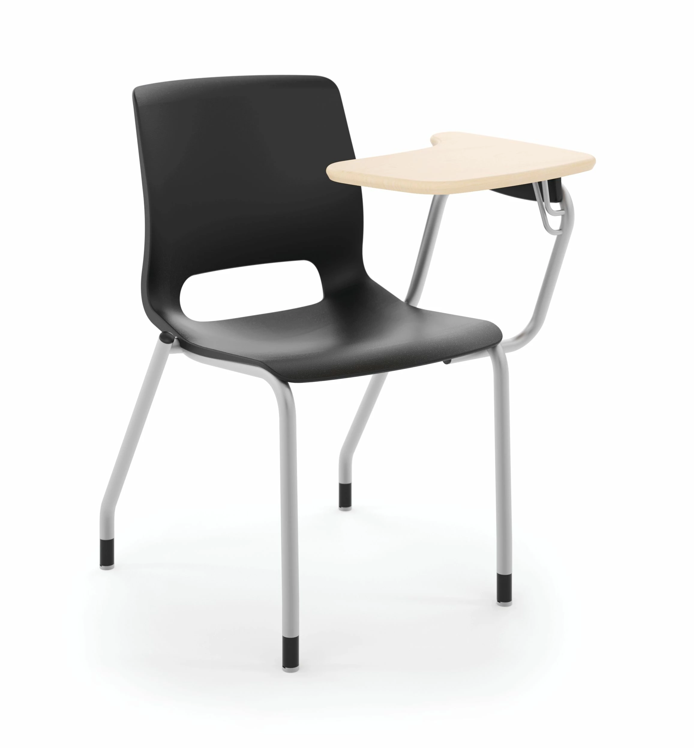 HON Motivate seating transforms any space into a dynamic environment. This four-leg chair features a tablet arm on the left side. The one-piece seat and backrest are contoured to the user’s body for longer-lasting comfort. Shell is Onyx; frame is Textured Platinum; tablet arm is Natural Maple.