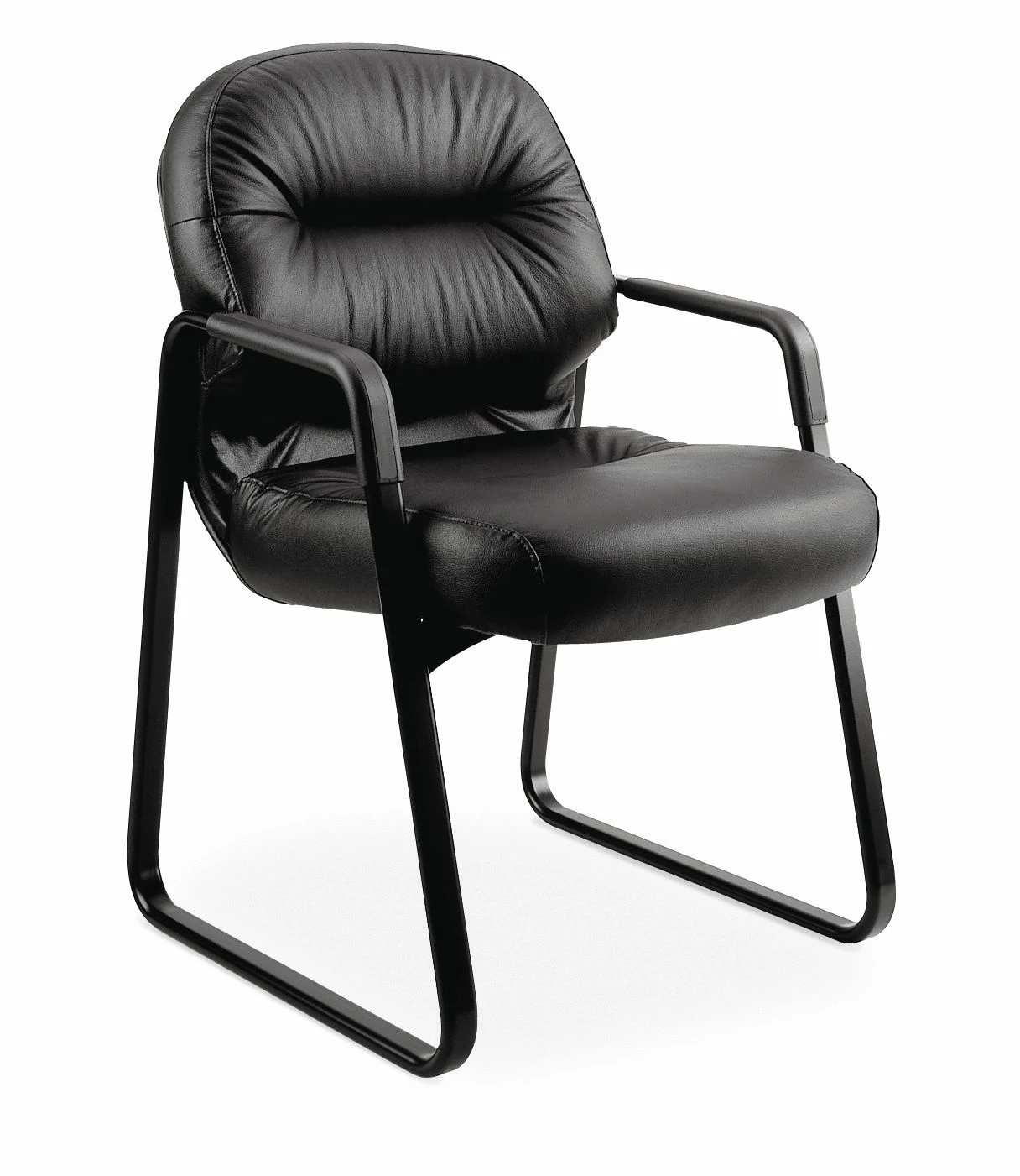 Pillow-Soft seating from HON merges whole-body support with an authoritative presence. This sled base guest chair has a resilient foam seat cushion, and a lumbar-cradling recess in the back. Warranted for users up to 300 lbs. Seat and back leather color is Black.