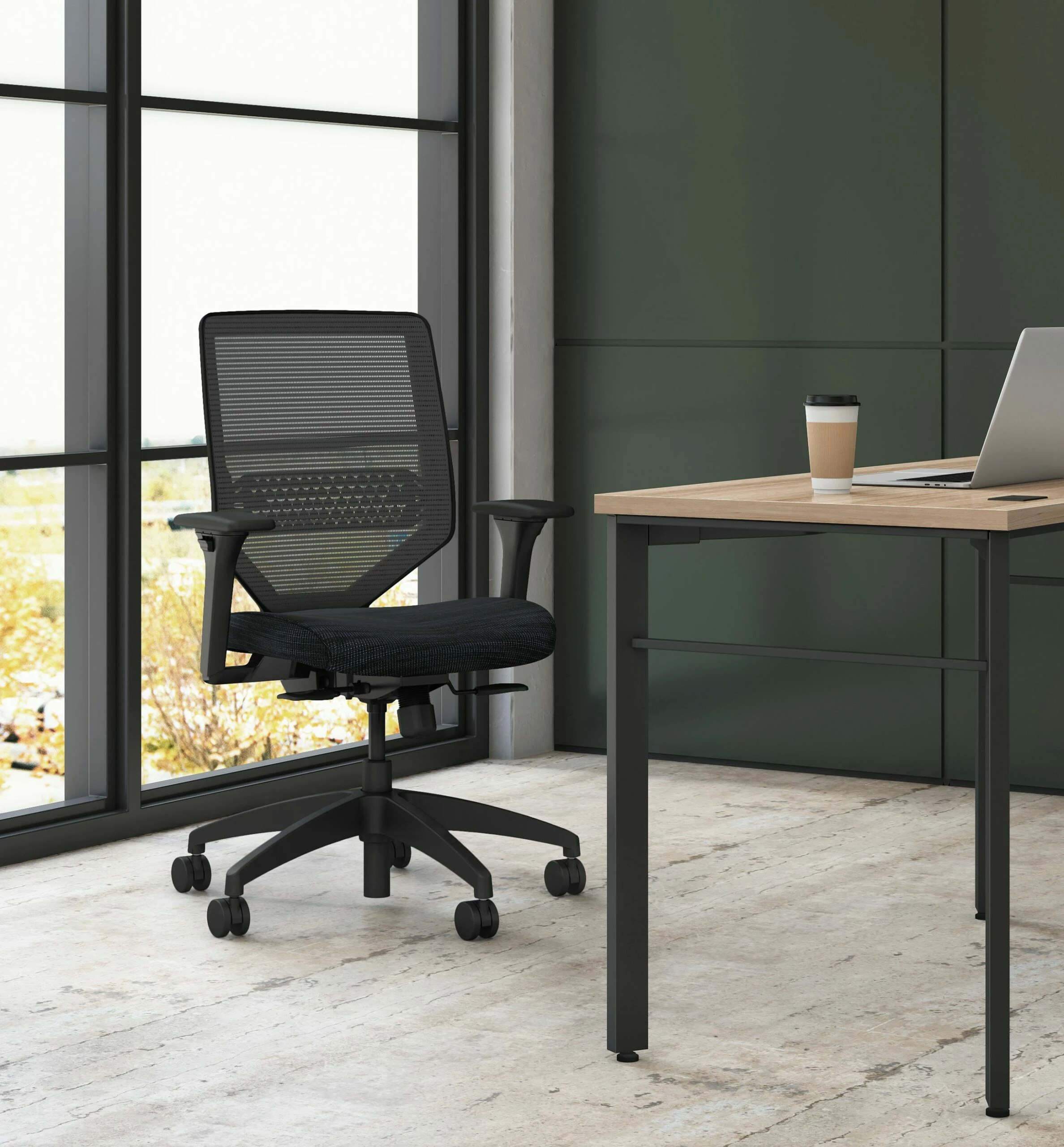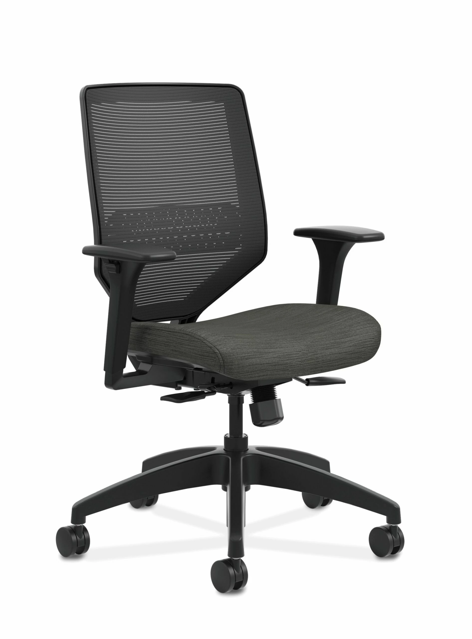 Solve is the single seating solution that helps a variety of users achieve optimal comfort. This Solve mid-back task chair features a responsive 4-way stretch mesh back to provide all-day comfort and support. The synchronized seat and back to provide proper balance, alignment and lumbar support, and can be adjusted with a single lever. Upholstery color is Ink; frame color is Black; mesh color is Black.