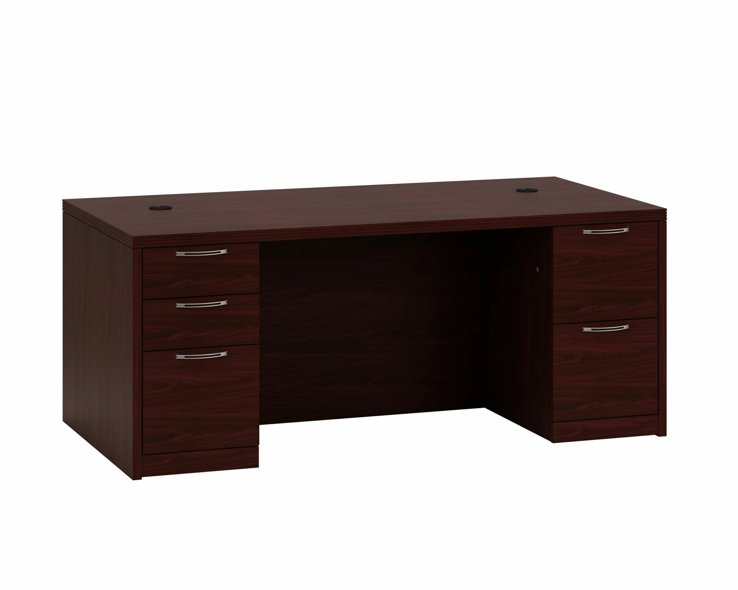 Valido laminate desks from HON features an extra thick top with ribbon edgebanding. This 72″W double pedestal desk can be used alone, or paired with a double pedestal credenza and stack-on hutch to create an executive workstation. Laminate color is Mahogany with Satin Nickel Crescent drawer pulls.