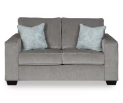 If style is the question, then this striking loveseat from Ashley is the answer. Sporting clean lines and sleek track arms, the decidedly contemporary profile is enhanced with plump cushioning and a chenille-feel upholstery that’s so pleasing to the touch. Sure to play well with many color schemes, this loveseat in richly neutral alloy includes a pair of understated floral pattern pillows that help add a fashionably fresh appeal to any living or family room.