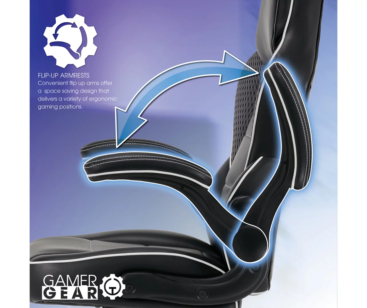 Look no further than this gaming chair from GamerGear. Covered in a ComfortSoft faux leather with mesh accents and contrast piping, this chair is built for comfort and style. The space saving flip-up arms with padded armrests give you plenty of room to move, while the five-star base with dual-wheel 360° mobility casters let you navigate your space with ease. The waterfall seat edge promotes healthy circulation by reducing pressure on back of leg. Pneumatic height adjustments customize your chair to fit your needs, whether you’re gaming, working or just relaxing. And with tilt tension adjustment and tilt lock-out features to meet the perfect position for your body and avoid discomfort during those long gaming sessions.